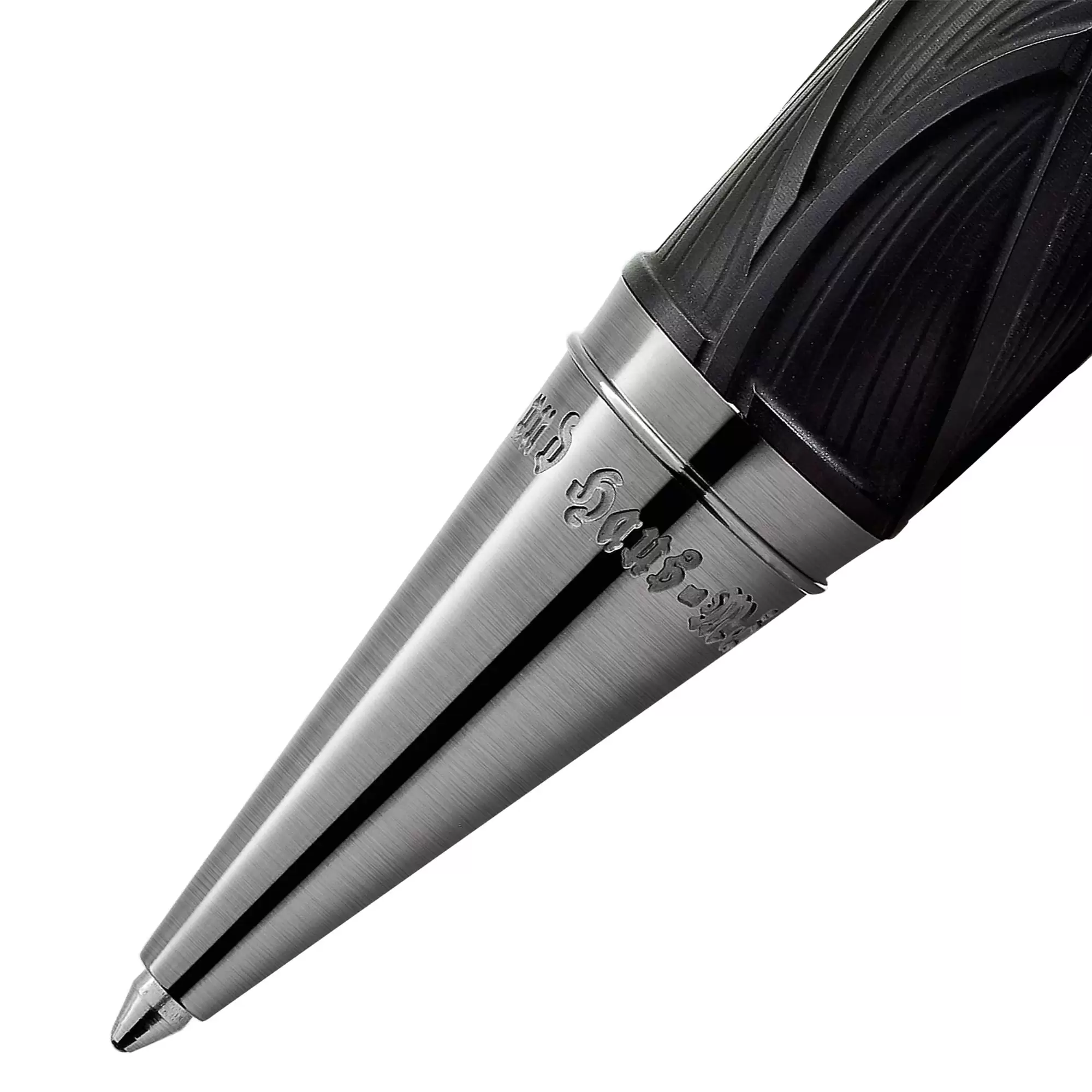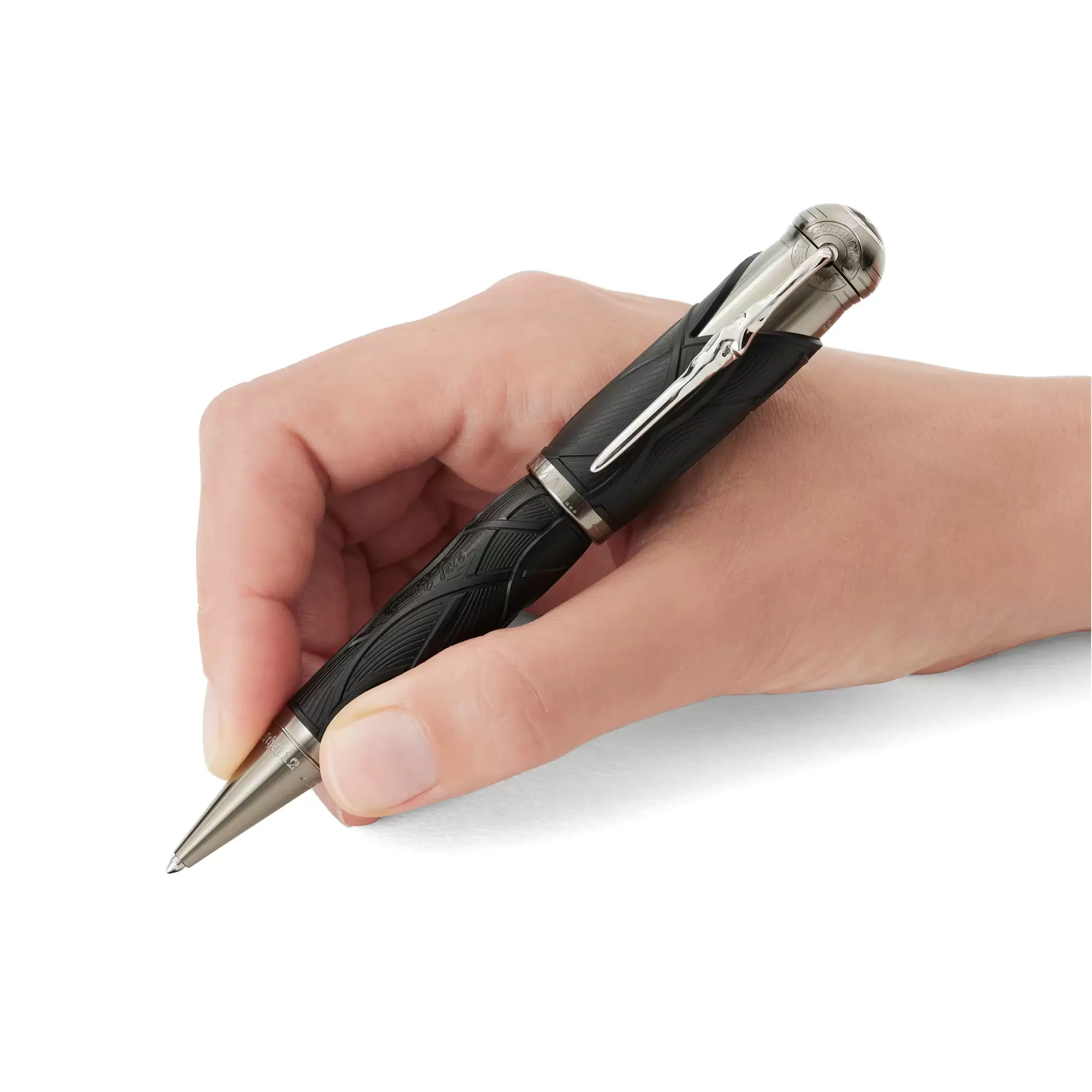 Penna a sfera Montblanc Writers Edition Homage to Brothers Grimm è dedicata a Jacob e Wilhelm Grimm e celebra il loro lavoro di raccolta e rielaborazione delle fiabe popolari tedesche ed europee, fra le quali ricordiamo alcune delle più celebri come “Biancaneve”, “Cenerentola” e “La bella addormentata”. La silhouette complessiva dello strumento da scrittura riprende la forma di un antico bastone da montagna e il colore nero evoca l’oscurità delle foreste, scenario abituale delle fiabe popolari dei fratelli Grimm. Inoltre, il motivo a onde sul corpo e sul cappuccio è ispirato ai capelli di Raperonzolo ed evoca anche la forma delle radici, riferimento al fatto che i fratelli Grimm vedevano il loro lavoro linguistico come una “ricerca legata alle radici”. Il cappuccio è coronato dall’emblema Montblanc in pregiata resina. Quando viene ruotata, la clip finitura platino, ispirata a un pezzo di legno nodoso, rivela a sorpresa la silhouette del profilo dei fratelli Grimm. Venduta con scatola originale Montblanc e garanzia
